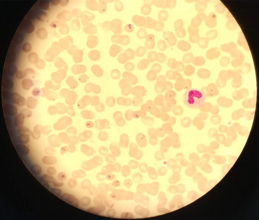 5月8日早晨,值班人员汇报该患者血小板结果出现危急值,需要血涂片复检。检验科医师随即查找到该患者血细胞分析结果标本,进行血涂片的制备、染色,随后镜检发现:大多数成熟红细胞中有疟原虫环状体结构。