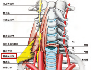 星状神经节是颈交感神经系统的一部分,是颈下神经节和第一胸神经节融合形成的交感神经节,双侧颈部各有一个。