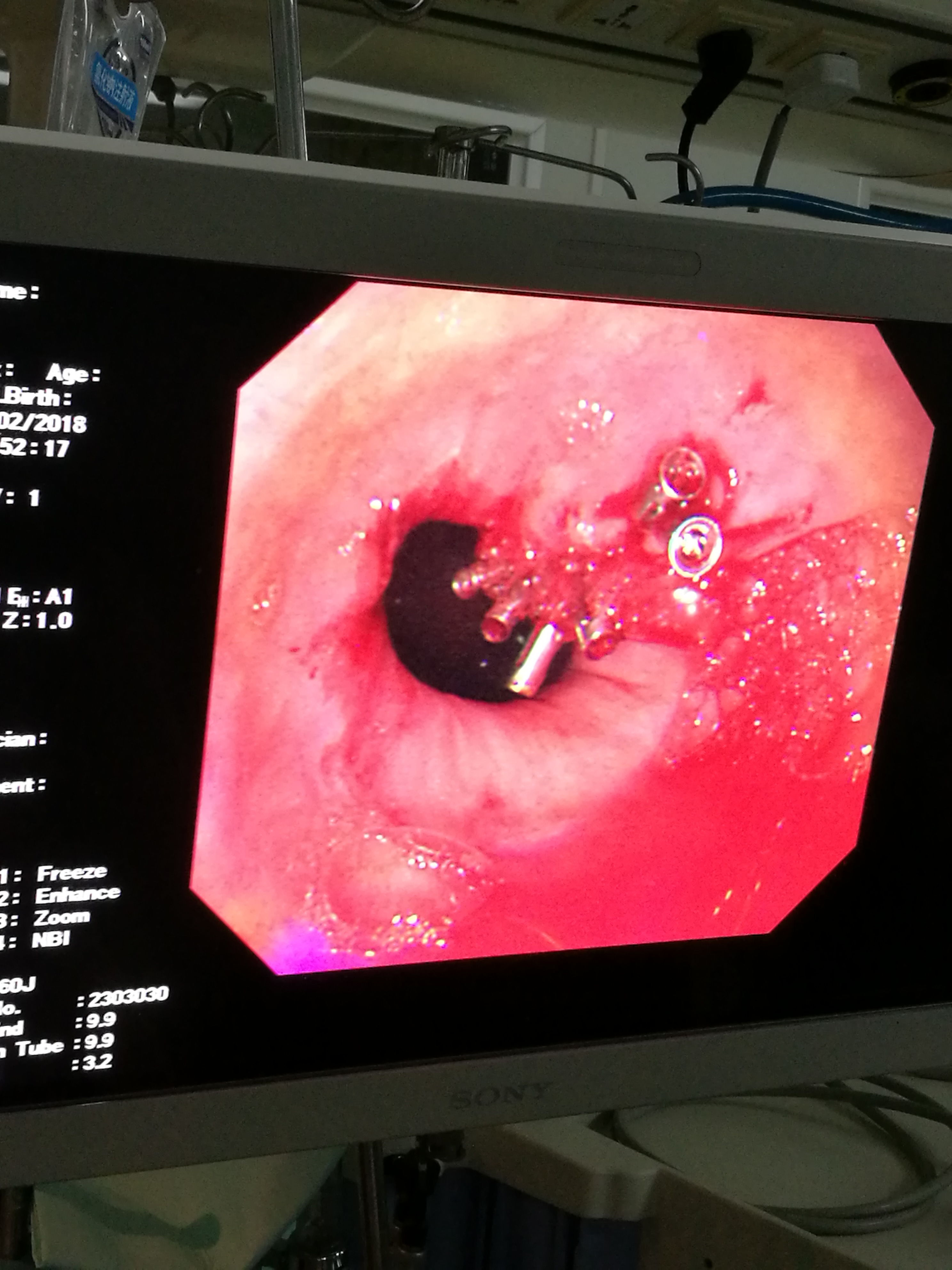 “继续准备钛夹!”连续的咔咔声后,5个钛夹牢牢夹在了出血灶周围,用生理盐水冲洗病灶观察后再未见活动性出血,在场的所有医护人员终于松了口气。然而一波未平,一波又起,胃镜退出后,患者再次呕吐出较多陈旧性血凝块,并由于意识不清发生误吸,“病人误吸严重,氧饱和度下降,立即准备气管插管!”